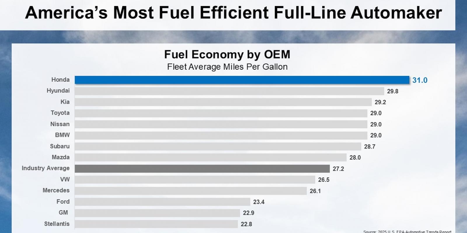 Honda leads the U.S. auto industry with the highest fleet average fuel economy of all automakers producing a full line up of gasoline-powered and electrified vehicles in America, according to the a U.S. Environmental Protection Agency (EPA) Automotive Trends Report.